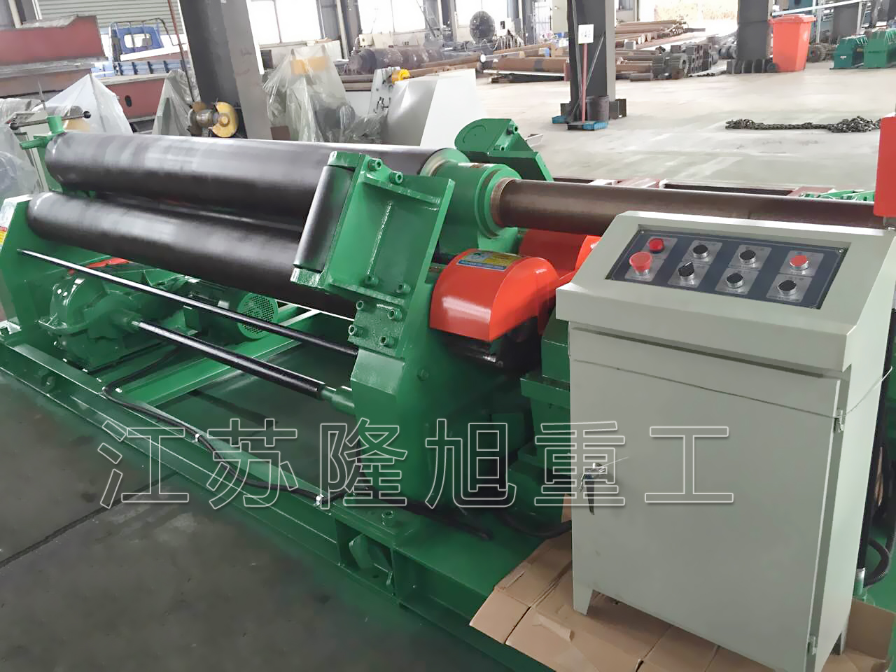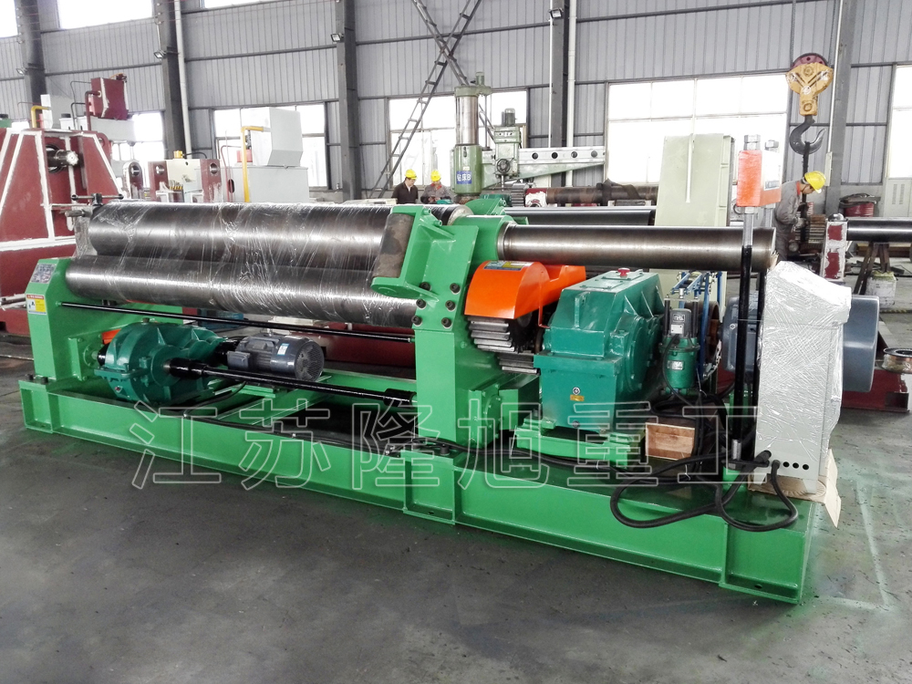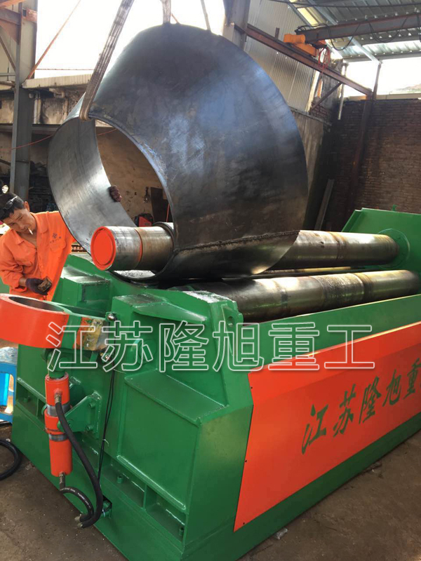 挡轮法的缺点是对工件一端的板边有损伤。挡轮可绕自身轴旋转,且能沿自身轴线上下窜动,挡轮表面淬火,这可减轻对板边的损伤;在可能的情况下,将挡轮与上辊的距离拉大,既能减小挡轮与工件的作用力,也可增大对厚工件的作用力,这需要先预弯较长的板端。