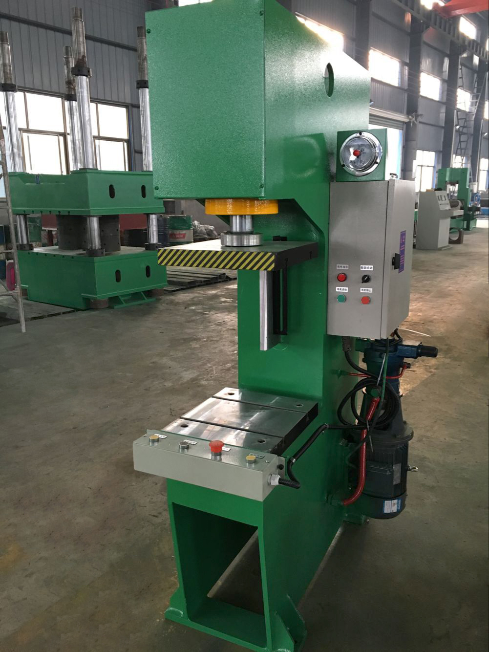 性能特点:本系列单柱式液压机通过计算机优化直立式C型结构设计,刚性好,采用钢板焊接,焊接后通过回火时效处理,确保机身永不变形。液压系统安装于机身内,外型美观,结构紧凑,操作方便。本系列液压机设有独立的液压与电器控制系统,采用按钮集中控制,可实现定程和定压两种成型工艺,机器行程、压力可在规定范围内调节;本压机压头采用四柱导向,具有抗偏载能力。